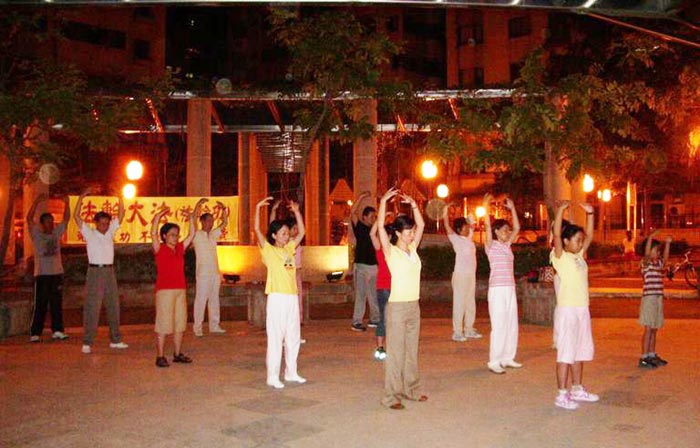 点上的学员每天都准时出来炼功,形成集体炼功的环境。有时我们在炼功时,偶尔会有些小朋友,因为好奇,在我们周围嬉戏,有的骑着脚踏车在我们当中穿梭,无形中形成一种干扰,但是当我们不为其所动时,炼功场纯正、祥和的场就能改变环境,真是“境随心转”啊!