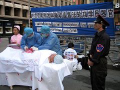 挪威法轮功学员于2006年7月28日,在挪威首都奥斯陆市中心,以模拟演示的方式揭露中共活体摘取并出售法轮功学员器官的黑幕,呼吁挪威民众伸出援手,共同制止发生在中国的这种惨无人道的暴行。