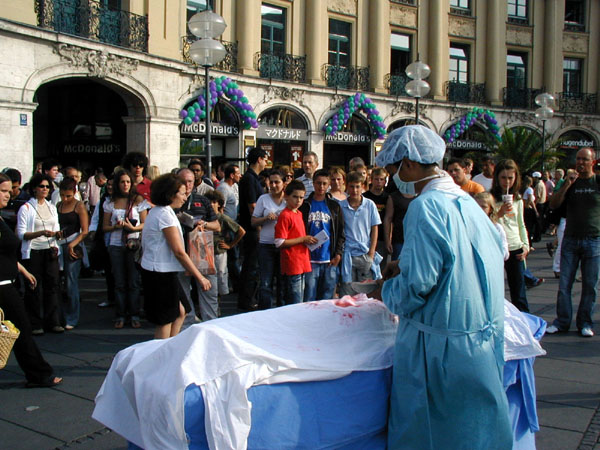 【明慧网2006年8月2日】挪威法轮功学员于2006年7月28日,在挪威首都奥斯陆市中心,以模拟演示的方式揭露中共活体摘取并出售法轮功学员器官的黑幕,呼吁挪威民众伸出援手,共同制止发生在中国的这种惨无人道的暴行。过往行人纷纷驻足观看演示,脸上流露出震惊的表情。明白真相的人们主动签名要求制止中共这一群体灭绝的罪恶。