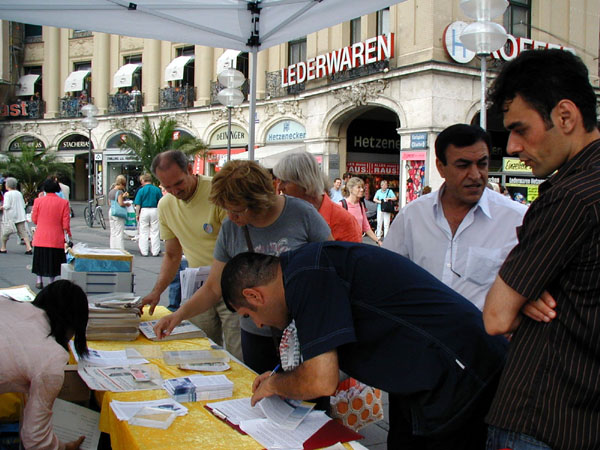 上午,一位来自柏林某电台的年轻女士采访了两位学员。针对活动的目的,她提了几个问题。为什么他们修炼法轮功,为什么他们参加抗议活动。也许她能通过这次活动让她的年轻的听众了解更多信息,让更多人知道迫害的情况。
