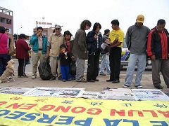 今年7月28日是秘鲁独立185周年的纪念日,也是国庆日。7月22日,华人最大的超市埃•黄(E.WONG)在观花埠(MIRAFLORES)市区举办社区庆典大游行活动,这个地区的人们倾城而出。法轮功学员向前来观看游行的人群发放传单,不时会听到接传单的人说:这是我曾在网上看到的内容,我支持你们。有的接到传单后兴奋的说:这是我要找的法轮功。