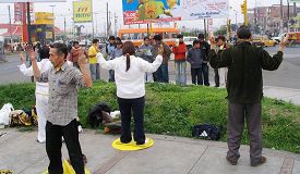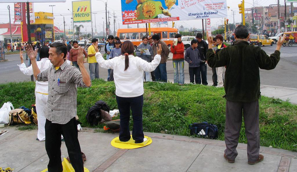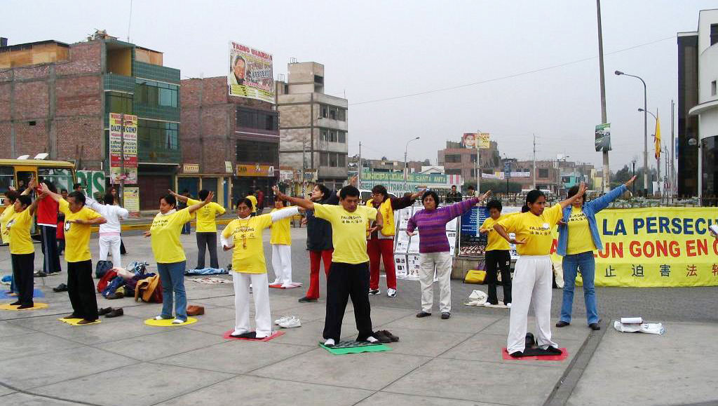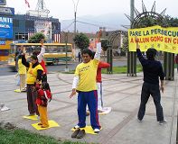 在首都利马华人社区的意大利广场,经市政府批准允许,法轮功学员每逢周五下午固定在这里洪法。学员们在此处悬挂揭露中共迫害法轮功的真相图片和呼吁制止迫害的横幅,向来往的车辆和人群发放法轮功真相传单及支持退出中共的资料,并向民众展示法轮功五套功法。