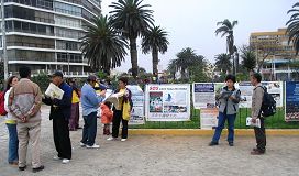 今年秘鲁总统大选前,秘鲁法轮大法学会向各党派领袖致信揭露中共活体摘取、盗卖法轮功学员人体器官的罪行,希望各党的领袖能认清中共的邪恶本质。秘鲁总统大选投票的日子,是各界民众最集中的时候。秘鲁利马各市区的学员利用投票选举的机会,向所在地的警察、各界民众,包括:在野党的领袖、商业巨头、政治要人发放有关的真相传单,让秘鲁各界民众认清中共的罪行。