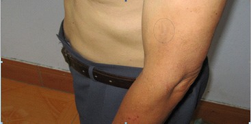 ![]() 上图:此处是恶警秦洁用小槐木棍将胳膊肉捣烂后化了脓留下的月牙形伤疤, 至今已过去六年多的时间,伤疤依然清晰可见。 |