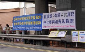 ![]() 香港学员在新加坡领馆外张起横幅,呼吁其政府停止参与迫害。 |