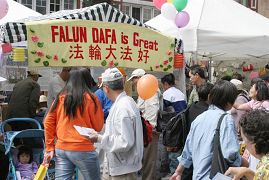 天国乐团的法轮功学员演奏 | ![]() 民众聚集在法轮功摊位前 |