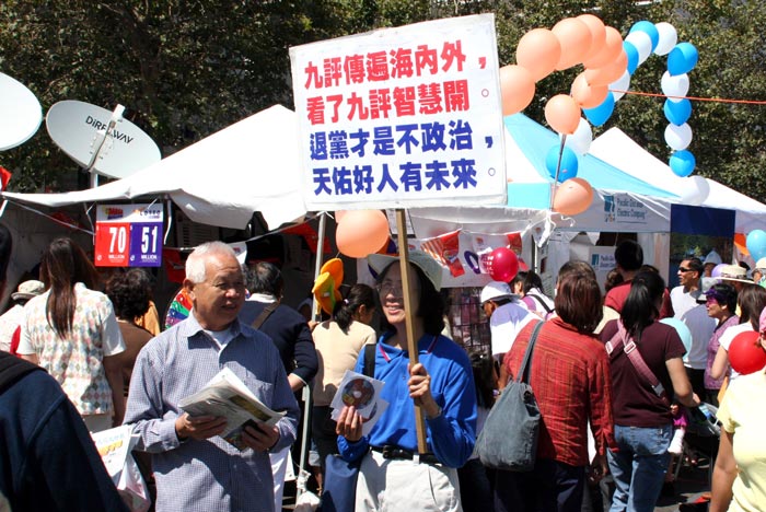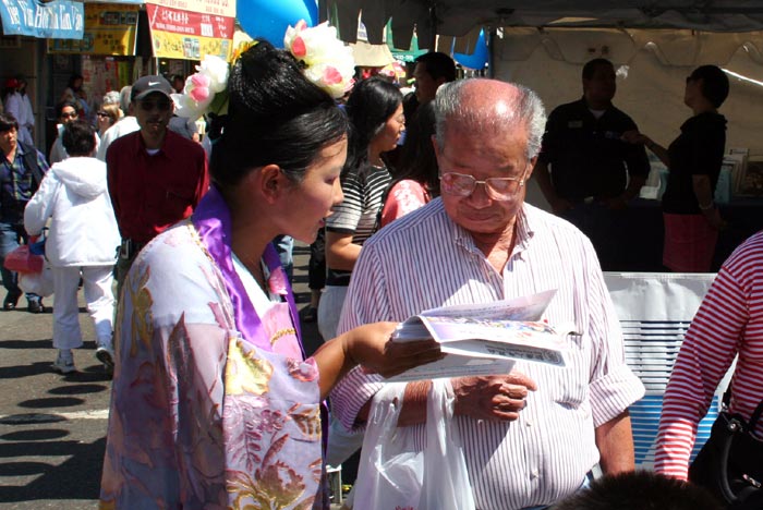 ![]() 身着唐装的学员向路人介绍法轮功真相 | ![]() 老先生接过九评共产党,脸上露出笑容 |