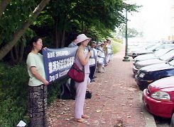 2006年8月29日中午,美国华盛顿DC部份法轮功学员在新加坡驻美大使馆前再次要求新加坡当局撤销对当地法轮功学员的无理指控,不要继续讨好中共。