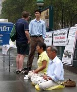 2006年8月28日上午,秋雨时不时的飘落,在纽约布碌伦区的最高法院前,两位精神抖擞的老人静静的打坐。