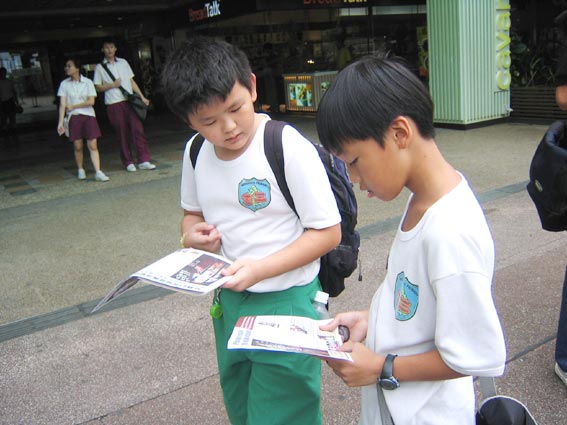 在许多热闹的地铁站,我们总会与各区的警察打交道,虽然他们拍照、要我们离开,但我们总是把真相讲给他们,很多警察都明白我们只是把展板靠在墙边,不影响民众,也不强迫民众拿资料,都很和平,所以我们在很多地方可以放展板,讲真相很长时间,有时候在地铁站讲真相发资料7,8个小时。记的在去年的圣诞节及今年初的综艺大游行,乌节路上有很多民众。综艺大游行时还封路,很多老百姓都乘搭地铁,那时候一整天数以万计的民众都要经过乌节路的地铁站,我们还是把展板摆在路一边,讲真相发资料,警察还在那里巡逻呢,甚至对着我们报以会心的微笑。我们也碰到即使警察来了,地铁站的负责人还是不听真相,一定要我们走。记的一次在海军部地铁站,我们带着难过的心情离开了,我们也遗憾至今,我们没有回去跟他们再讲真相。