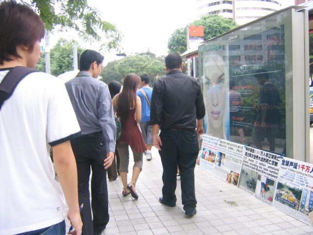 武吉士观音庙是我们常去的地方。这个观音庙有几十年的历史,加上周围的商店林立,交通方便,吸引全岛众多华人到来,还有许多走江湖人士,如跌打、卖膏药、算命的等等,常吸引一大堆人群围着观看。当时法轮功学员把展板放在庙宇附近的两排木制栏杆上,就马上吸引了很多民众,有看到中共迫害法轮功的残酷而震惊的,有被谎言欺骗,不相信中共会如此对待老百姓,而暴跳如雷的。法轮功学员面对这样的人讲真相,马上围来一大群民众,你一句我一句的攻击法轮功学员,侮辱的言语,不堪入耳的粗话都能从这些人的口中发出。记的有一次法轮功学员被民众用侮辱话骂的很厉害,围了很多人,你一句他一句,学员忍住没吱声,结果另一些人看不过眼,叫那些人不要这样对待法轮功学员,他们争吵起来,最后两群人很快就散了。有的学员还被民众打,但法轮功学员没有还手,继续讲真相,警察时不时到那里。