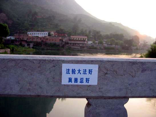 ![]() 太行八泉峡风景区安波桥上的不干胶:“法轮大法好、真善忍好”。 |