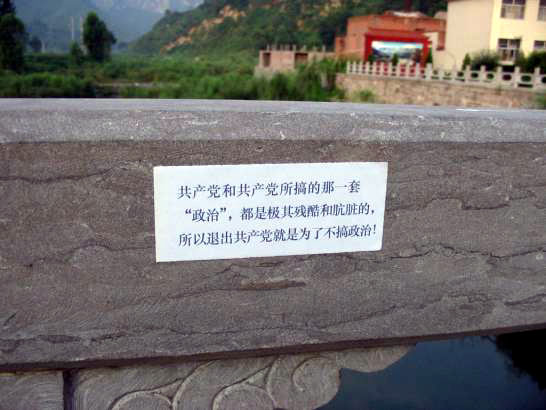 ![]() 贴在太行八泉峡风景区护栏上的不干胶“共产党和共产党所搞的一套‘政治’,都是极其残酷和肮脏的,所以退出共产党就是为了不搞政治!” |