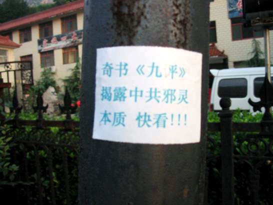 ![]() 贴在太行八泉峡风景区的不干胶“清除中共邪灵!解体中共恶党!” |