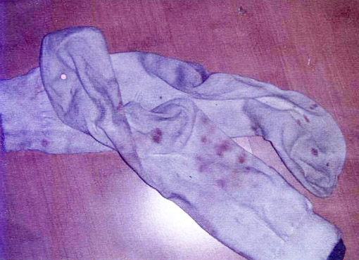 为了争取人权和自由,我不断的在监号里面讲真相,揭露一切谎言,把大法的美好带给监号里的每一个在押人员,并在监号里炼功。看守所所长传话,叫犯人用我的袜子堵住我的嘴,犯人还用擦厕所的抹布勒住我被塞进袜子的嘴里,我挣扎着吐出袜子,继续讲真相。十几名犯人轮番折磨我。我的嘴角被勒豁,嘴里面被捅破,流着血,塞嘴的袜子上都是血迹(见上图)。所长还唆使犯人轮番的掰我的手脚和四肢,造成极大痛苦。就象这样的迫害每天少则几次,多则连续七八个小时,我生活在这人间地狱之中,受尽了酷刑的迫害。