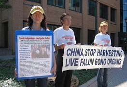 二零零六年八月三十日,法轮功学员来到加拿大滑铁卢市府门前及凯臣那市府前向市府工作人员揭露中共活体摘取法轮功学员器官并从中牟取暴利的行径。