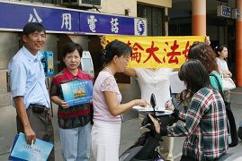 二○○六年八月卅一日,台湾屏东法轮功学员在人潮鼎沸的火车站前向往来旅客就新加坡当局以所谓“非法集会”为名,拟于近日开庭强令遣返法轮功学员离开新加坡、甚至对多名派发中共迫害法轮功真相资料的学员进行控罪的不公事件,希望屏东乡亲以签名的方式传真给新加坡承办法庭及李光耀办公室,要求撤销对新加坡法轮功学员的起诉。