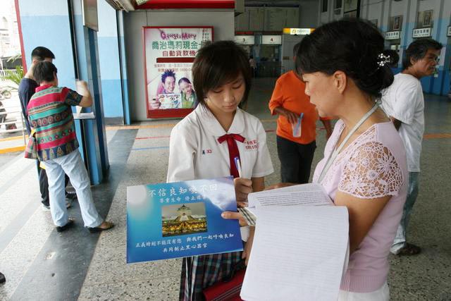 ![]() 台湾屏东法轮功学员在火车站前向往来旅客征签,吁新加坡政府立即撤销对法轮功学员的起诉 |