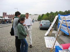 在展台还没有完全布置好的时候,就已经有人来看板了。尽管天气不是很好,还是有很多人来到展台前。几乎所有的行人都从学员们手里接过了传单。许多人阅读传单上的消息,一些人立即和学员攀谈起来。即使在下雨的时候,仍然有许多人在签名簿上留下了他们的名字,呼吁德国政府采取行动来制止在中国发生的对法轮功学员活体摘取器官等迫害。