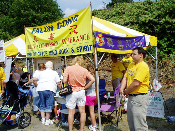 一家祖母、父母和两个领养的中国孩子来到摊位前,他们说是在为孩子们寻根来了。当他们知道了“真、善、忍”的美好,中共对中国法轮功学员的残酷迫害后,表示会参加在新港图书馆的免费教功活动,他们要让孩子们学到真正的中国文化。
