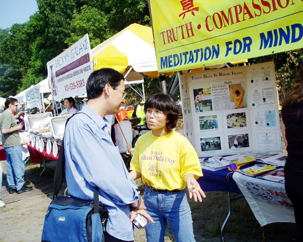 学员除了在摊位旁分发资料、功法演示外,折叠纸莲花更吸引大人和孩子们。游客、来自新英格兰地区及纽约州的三十五支参赛队,以及与会贵宾罗州议员肯尼迪、罗州副州长Charles Fogarty、黑石河旅游中心主任Bob Billington及台湾经文处处长杨国栋等人都有机会看到法轮大法真相。