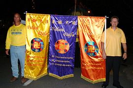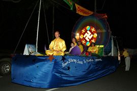 当天晚上的游行,两名学员拉着点缀了彩灯的“法轮大法”横幅走在最前面,随后是最吸引人们的由法轮功学员们表演的仙女舞蹈,两旁的民众给予了热烈的掌声。