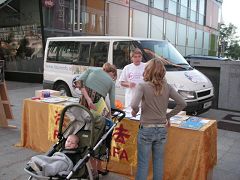 第一天的第一站是威拉荷(Villach),第一个到信息展位来的是位十一二岁的中国小女孩,她认真的看着展板。当地的副市长桑地色尔(Sandriesser)也到了展位前了解法轮功学员被中共残酷迫害的真相,并拿走了关于法轮功的详细资料。很多的当地民众都来签名支持反迫害。
