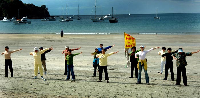 ![]() 优美如画的海边,法轮功学员展示祥和的功法 |