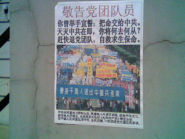 这是在当地拍下的“退党”标语等照片。有人来人往的大街上的,也有小巷中的,还有楼道里的,墙壁上的等等。