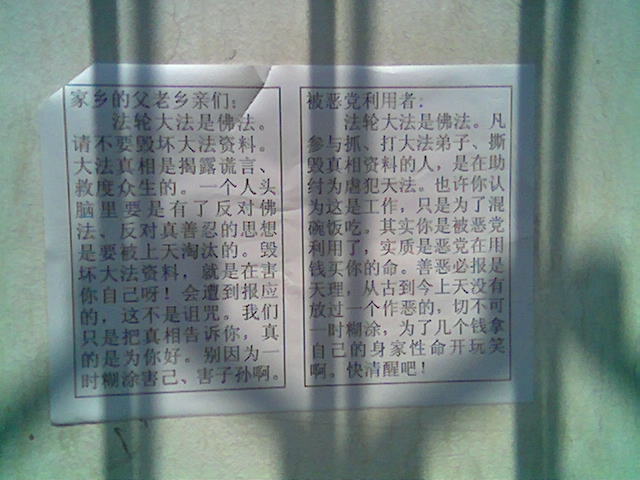 【明慧网二零零六年九月二十五日】 自《九评》发表以来,华北某市大法弟子努力做好师尊要求的三件事,证实大法,救度众生,使的当地的正法形势向可喜方向发展。这是每一个大法弟子无畏的精神,无私付出的结果,也是这一方众生得救的希望。