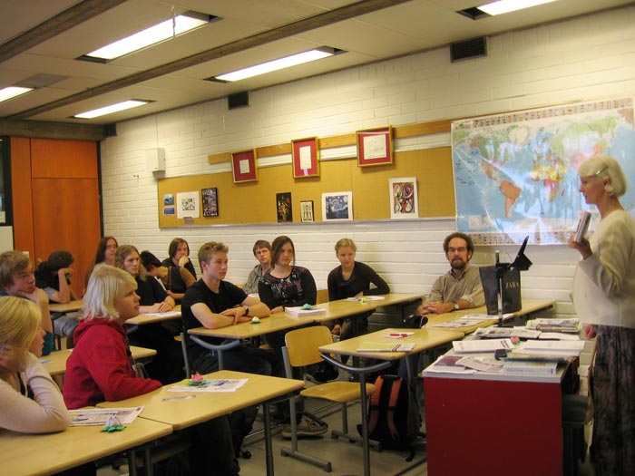 此邀请源自该班级的老师在亚欧峰会期间看到了法轮功的活动,然后在网上与学员联络,决定了此次活动。两位法轮功学员准时在该老师的引领下来到班级,除了班上的二十五位同学外,还来了一位对法轮功感兴趣的老师在后排就坐。