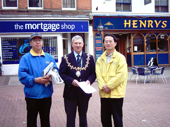 第三站是通肯(TAUNTON),当地市中心管理人员为了不影响交通,把法轮功学员们的展台安排在一个正在施工中的路口边。刚布置好展台不久,市长就来了。在表示了支持和问候,和学员一起合影留念之后,当即安排展台搬到大街的另一头,那里是当地最繁华的路口。