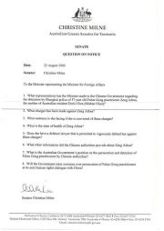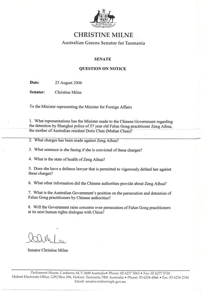 二零零六年八月二十三日,澳洲绿党参议员米尔恩(Christine Milne)在澳洲参议院议事录的书面质询(QUESTION ON NOTICE)单元中向外交部长唐纳发问,问题涉及澳洲政府关于澳洲永久居民陈慕涵的母亲、香港大法弟子曾爱华在上海被非法关押一事向中国政府交涉的情况、曾爱华可能受到的非法审判以及澳洲政府对受迫害的法轮功学员的立场等等。