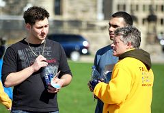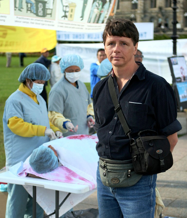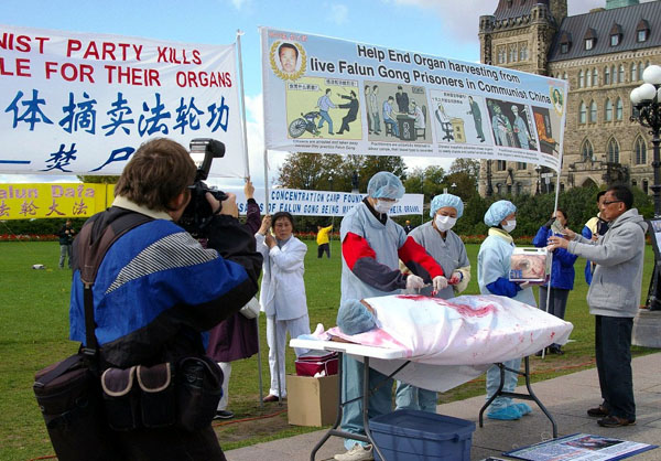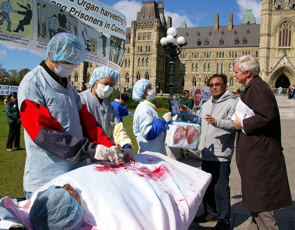 下午,独立调查报告作者之一的大卫•乔高参加完集会演讲后,走到“中共活体摘取法轮功学员器官模拟展”前,一个个的询问学员来自哪里,当知道学员有的来自多伦多、蒙特利尔和渥太华等城市时,他说:“你们辛苦了,你们做得很好,你们一定要坚持下去。”