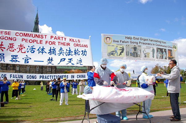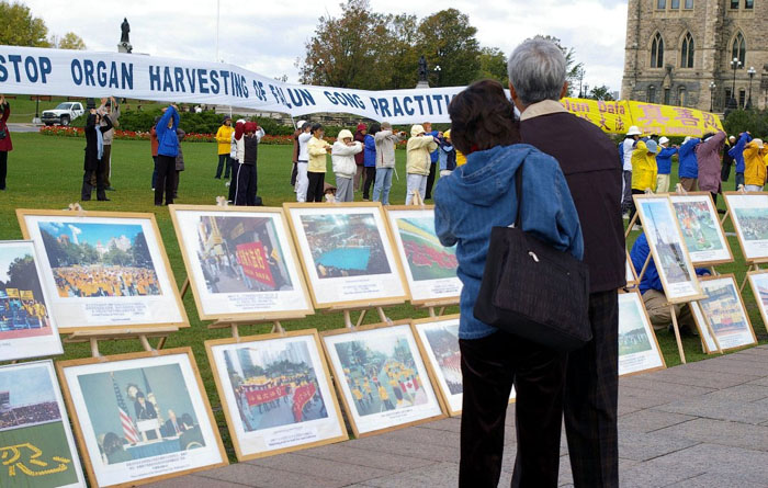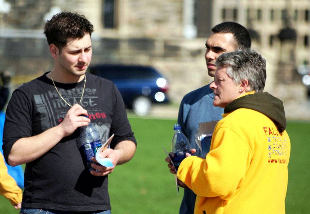 来自哥伦比亚省的Devon,来到签名摊位对学员说:“我要签名。我几星期前在国际新闻上就已听到这消息了,一直不知道怎么帮助你们,今天居然在渥太华让我碰到你们了。我们全家都来签名,希望我们的签名能起作用。”然后他走到“活摘器官模拟展”前让笔者拍了照,并说:“希望那个瞎了眼的政府(指中共)早点完蛋,你们一定要坚持到底。”