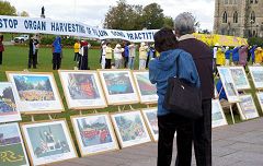 一直在拉着横幅的法轮功学员李卓夫对笔者说,有三位西人青年看到揭露“中共活体摘取法轮功学员器官”的模拟展后很吃惊,西人学员Joel给他们讲这是正在中国发生着的事情,并介绍了乔高和麦塔斯的调查报告。他们沉默了很久,突然其中的一位说:“我们赶紧拍照,他们是在创造历史啊!(They are making history)”