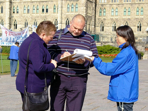 来自多伦多的老年法轮功学员黄光富一天一人就征得了两百多个反迫害签名,当笔者问及签名者的反应时,她说:“他们对我说了很多话,我都听不懂。我只会对他们说一句:“Thank you!(谢谢你)”当他们知道我不懂英文时,他们就竖起大拇指对我表示支持。”