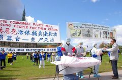 当天国会山庄前的风很大,学员们从早上八点就在这拉着横幅,一直坚持到下午四点。各党派的议员上下班经过时都能看到法轮功学员的诉求:“TOGETHER, STOP ORGAN HARVESTING OF FALUN GONG PRACTITIONERS IN CHINA”(共同制止中共活摘法轮功学员器官)。