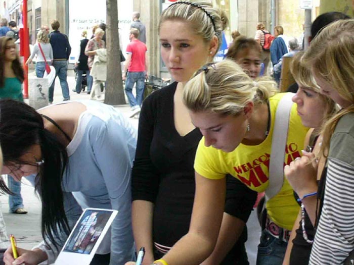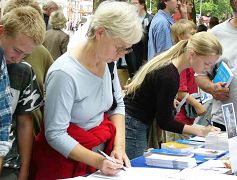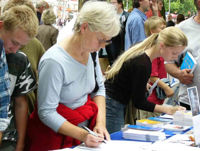 九月二日中午,德国汉堡学员再次来到市中心的伊达埃尔广场(Ida Ehre Platz),继续向汉堡市民讲真相,揭露中共活摘法轮功学员器官的罪行及李岚清和薄熙来的对此负有的责任。了解真相后要求在征签表上签字的人从未这样多过。人们或直奔展台要求学习炼功动作,或想知道法轮大法和其它功法的根本区别,或询问如何可以帮助学员停止迫害。人们往往索取资料后还站在咨询台前不想离去。