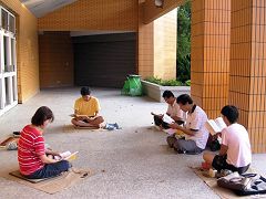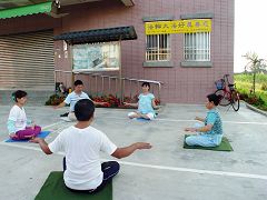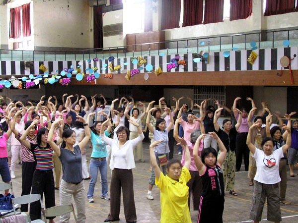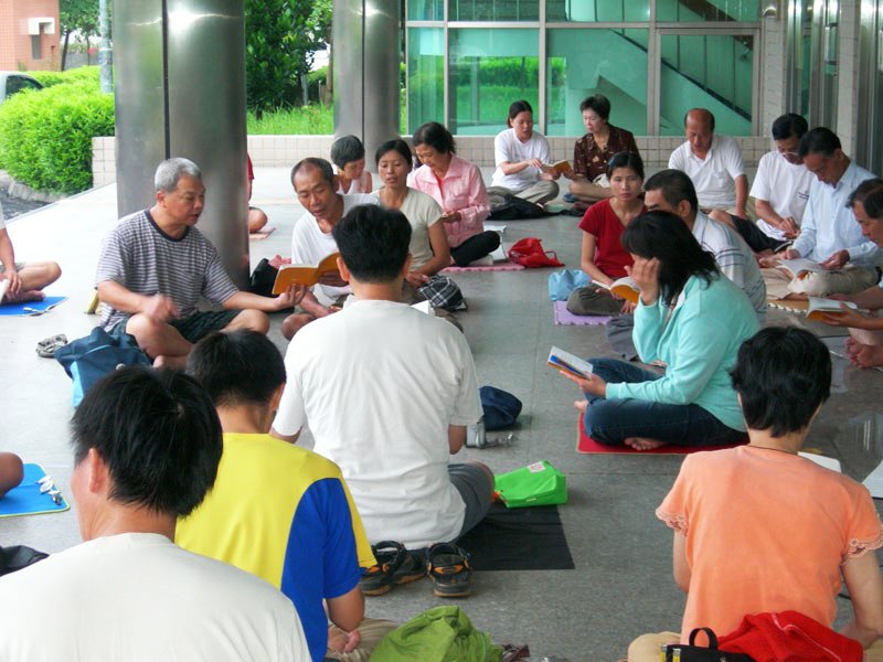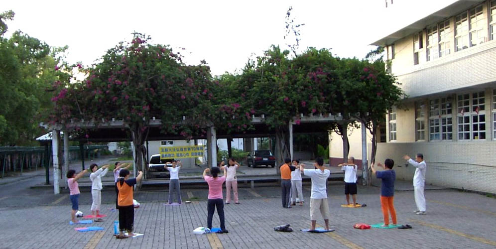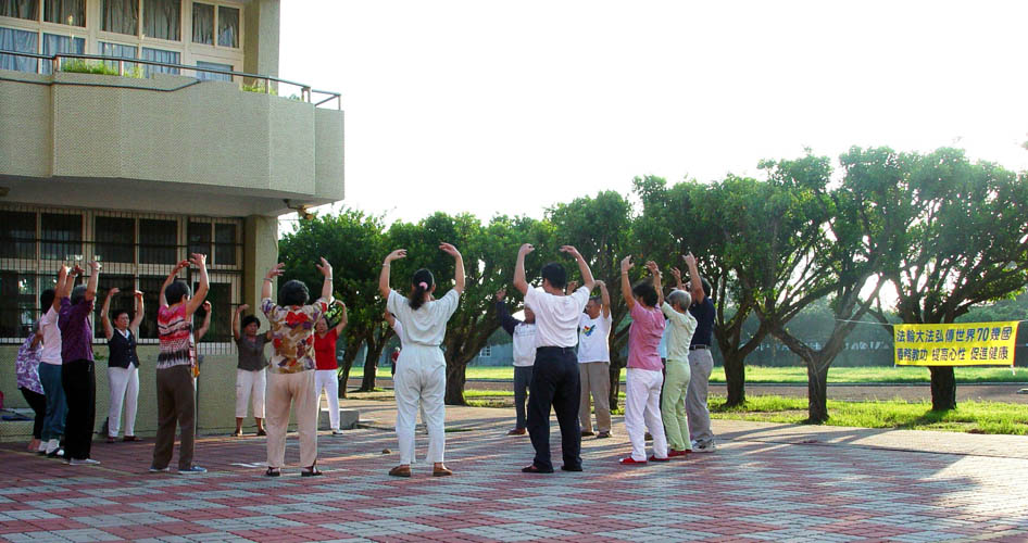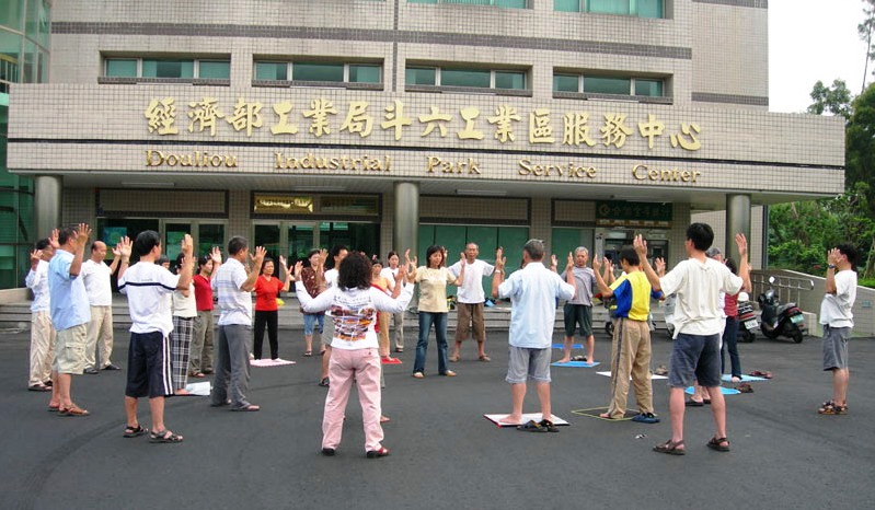 在台北市中正纪念堂广场前排组法轮功的标记“法轮”
