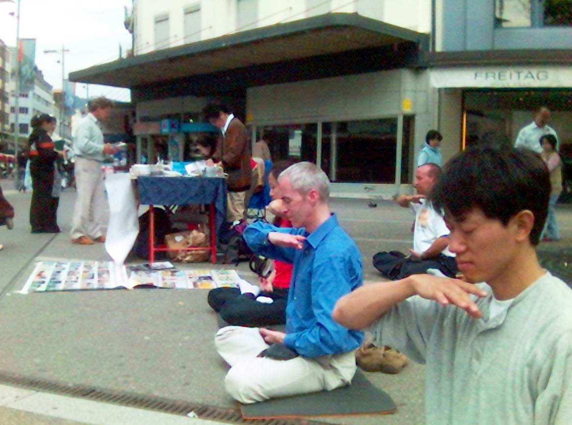 二日一大早,学员们正摆放资料的时候,就已经有行人驻足阅读了。紧接着越来越多的人停下脚步,看介绍法轮功以及发生在中国的迫害真相的展板。集体炼功更是吸引了许多行人的目光,酒店前喝咖啡的人、公共汽车上的乘客,还有等车的人等等,他们都注视着这优雅祥和的功法演示。有不少人询问当地炼功点的讯息,表示有兴趣炼法轮功。其中一个人正在服兵役,他只在Biel待一个月,还不怎么熟悉这里的街道,他也想炼,并表示一定要找到炼功点。
