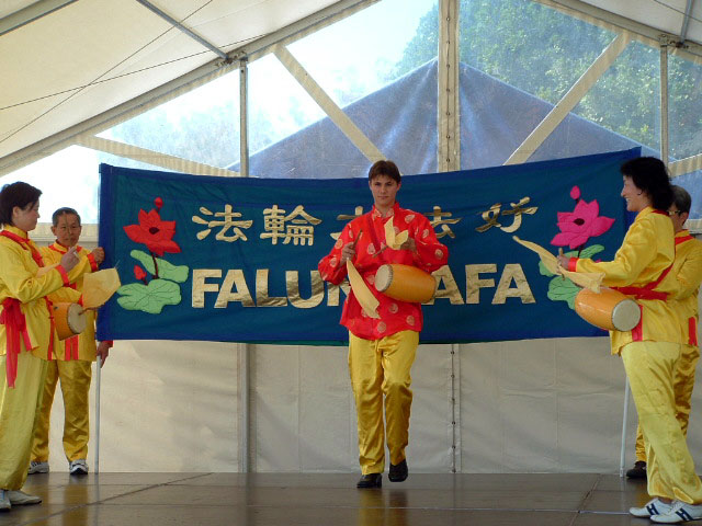 上午九点,活动主持人首先向观众介绍了法轮大法。接着,数位学员上台演示法轮功的五套功法。金黄色的炼功服、祥和的动作及音乐,加上学员的同步解说,吸引了民众的目光。学员们还陆续表演了绸带舞、唐装展示、花仙舞、腰鼓等精彩节目,将正统的中华文化展现于澳洲民众面前。