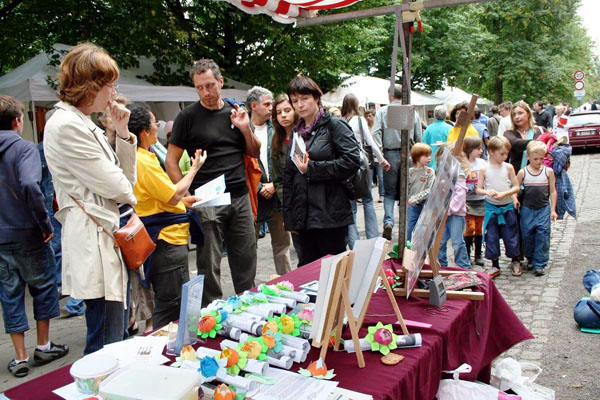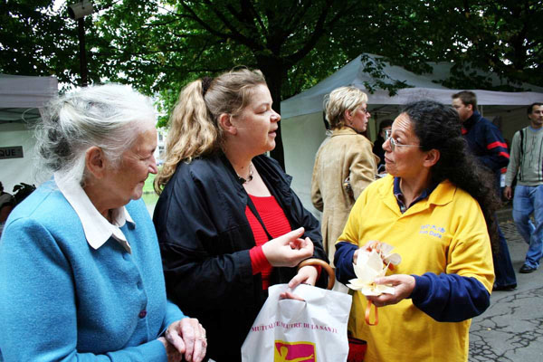 一位女士第一天参加文化节,路过大法展台时,被漂亮的纸莲花吸引住了,当她了解到中共迫害法轮功的真相及莲花代表修炼者出淤泥而不染的内涵时,她开始认真学做折纸莲花。临走时索取了一些大法真相资料和法文的《九评共产党》。第二天,她带着母亲来看望学员,拿出来昨天受启发、自己创制的纸莲花,送给了学员,并带来裁剪好制作莲花的纸,当即教会了学员。她说:“我被你们所感动,我看到的是一颗颗善良的心。”