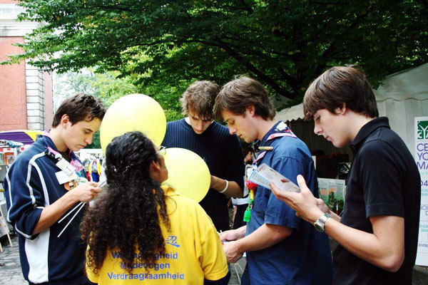 法轮功展台前的人群始终络绎不绝,几名童子军协会的年轻人也前来看个究竟,他们友善的和学员交谈起来,当得知中共长达七年残酷迫害法轮功的情况后,他们被震惊了,默默的认真听着。最后学员心情沉重的说:“我们每一个人都有责任帮助尽快结束这场迫害。”他们点点头,表示会上网去了解更多的大法信息。