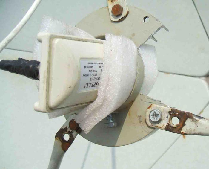 9、 用高强度泡沫海绵和软硬适中的绑线,把双本振高频头固定好。