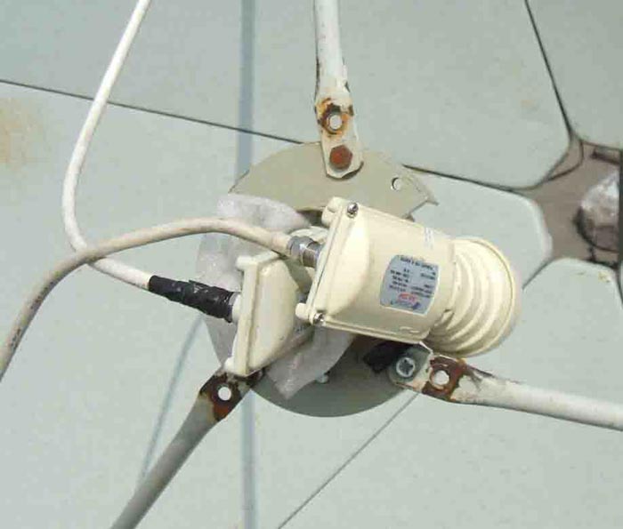 1、 卸下原来的C波段高频头,在馈源(就是固定C波段高频头的金属圈)右上角做上记号,卸下馈源盘。因为一锅双星两颗卫星的间隙不大,必须用钢锯在馈源盘右上角锯掉一块缺口以缩小间距,否则间距过大,无法调试成功。缺口大小应比双本振高频头直径大一些,以便调试。(见图一)
