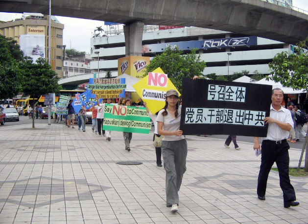 游行于下午三时开始,声援三退(退出中共党、团、队)的队伍从吉隆坡武吉免登区出发,沿着普都路,一路走到茨厂街,沿途吸引了各种族路人围观。声援的队伍高举着多幅写有“声援一千七百万三退勇士”、“号召中共党员退出中共”、“全球反中共迫害”、“中共欺骗了全世界”、“结束中共暴政,造福全人类”等展板,一路上不断以中、英和马来文喊着“天灭中共、退党保平安”、“No Communism(不要共产主义)”、“No CCP(不要共产党)”等口号,吸引了不少民众驻足观看,大纪元的义工们也向民众派发退党的相关资料。