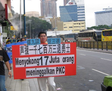 马来西亚退党服务中心发言人张旭峰在稍后举行的集会上宣读了退党服务中心的新年公告,告知民众中共恶党气数已尽,天灭中共在即,希望每个中国同胞都认清和接受这一现实,并自觉参与到广传九评力促三退的历史壮举之中,为彻底解体中共恶党、清除邪党文化在方方面面的流毒,重建中华正统道德,复兴中华神传文化而努力。