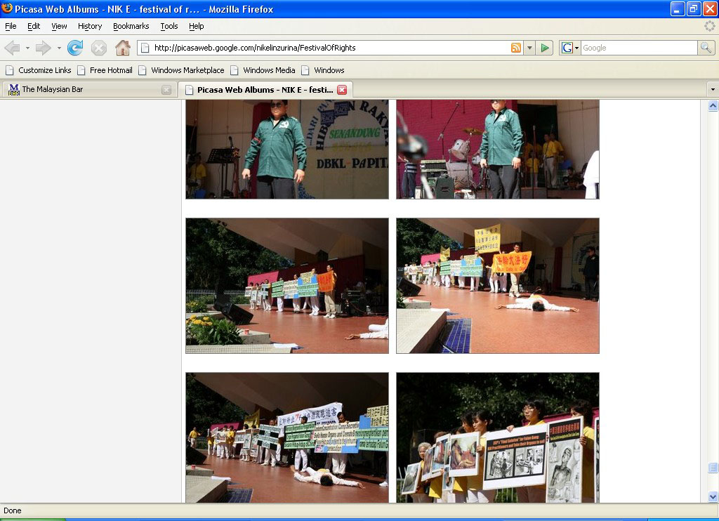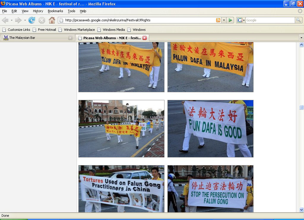 ![]() 马来西亚律师公会网站人权日文章的连线图片库中放了多张当天的活动照片。以上为法轮功学员游行的部份照片 |