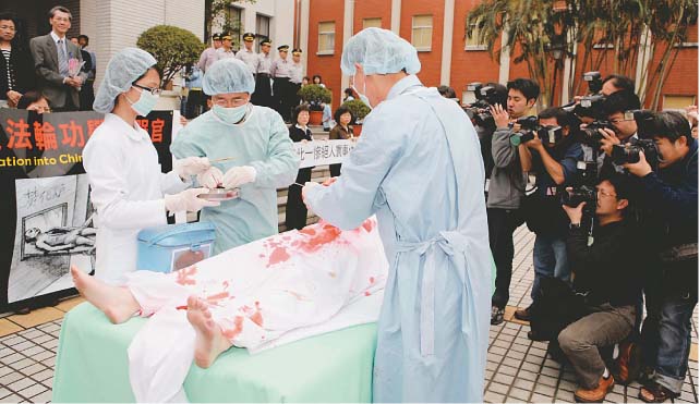 ![]() 中共活体摘取法轮功学员器官的模拟手术场景 |